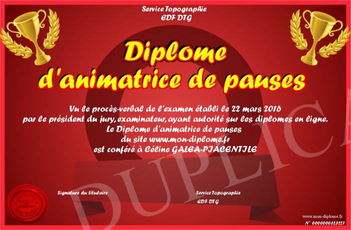 Envoyez par email votre Diplôme d'animatrice de pauses personalisé