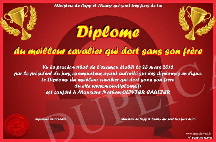 Envoyez par email votre Diplôme du meilleur cavalier qui dort sans son frère personalisé