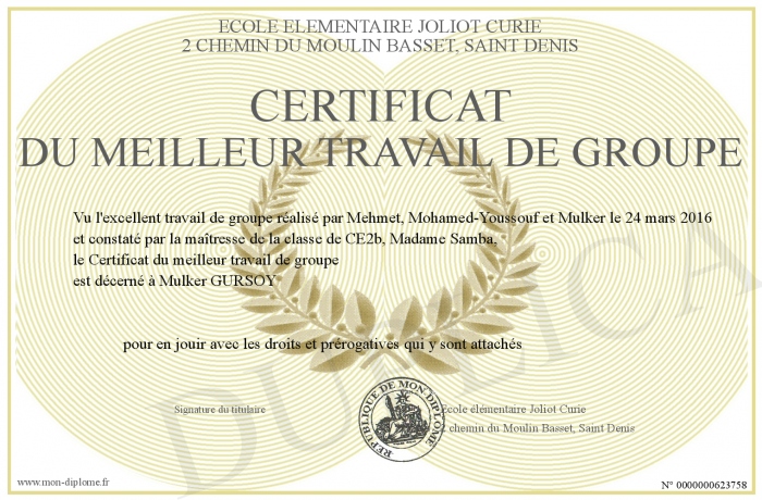 Envoyez par email votre Certificat du meilleur travail de groupe personalisé