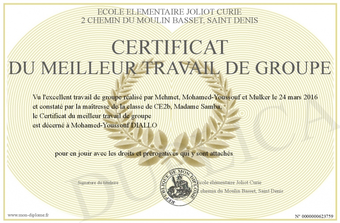 Envoyez par email votre Certificat du meilleur travail de groupe personalisé