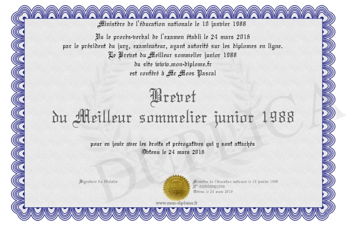 Envoyez par email votre Brevet du Meilleur sommelier junior 1988 personalisé