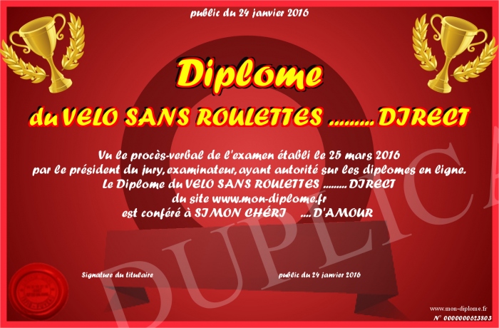 Envoyez par email votre Diplôme du VELO SANS ROULETTES ......... DIRECT personalisé