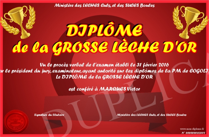 Envoyez par email votre DIPLÔME de la GROSSE LÈCHE D'OR personalisé