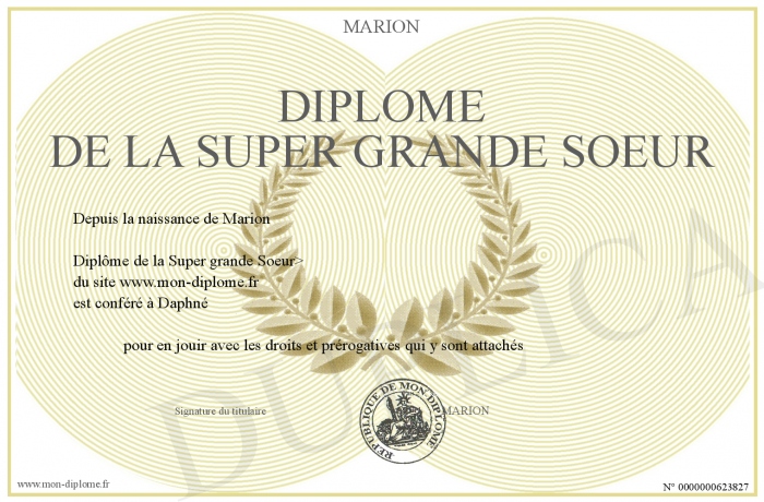 Envoyez par email votre Diplôme de la Super grande soeur personalisé