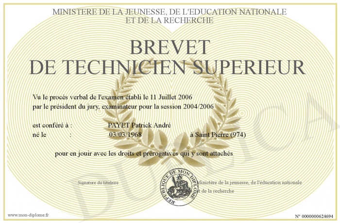 Envoyez par email votre BREVET DE TECHNICIEN SUPERIEUR personalisé