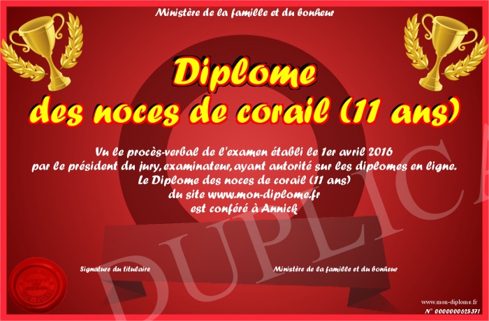 Envoyez par email votre Diplôme des noces de corail (11 ans) personalisé