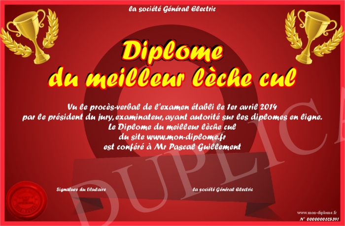 Envoyez par email votre Diplôme du meilleur lèche cul personalisé