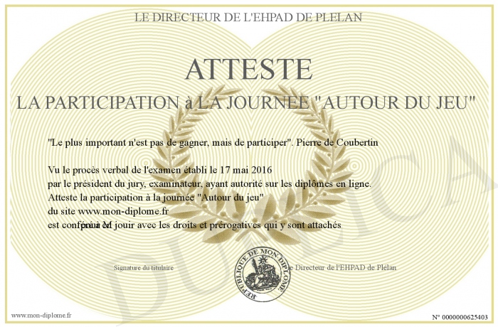 Envoyez par email votre Atteste la participation à la journée -Autour du jeu- personalisé