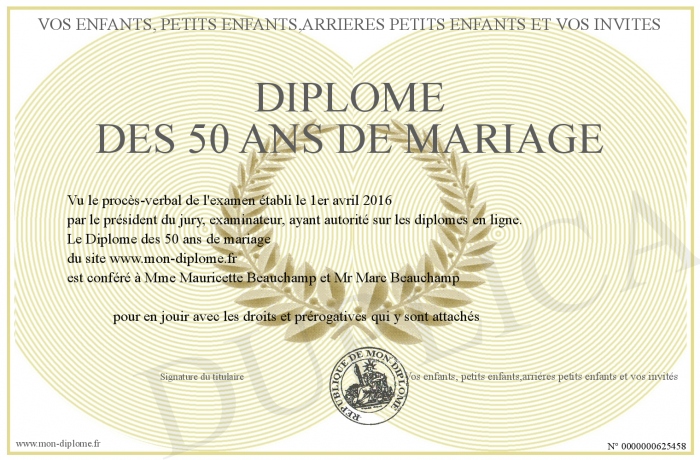 Envoyez par email votre Diplôme des 50 ans de mariage personalisé