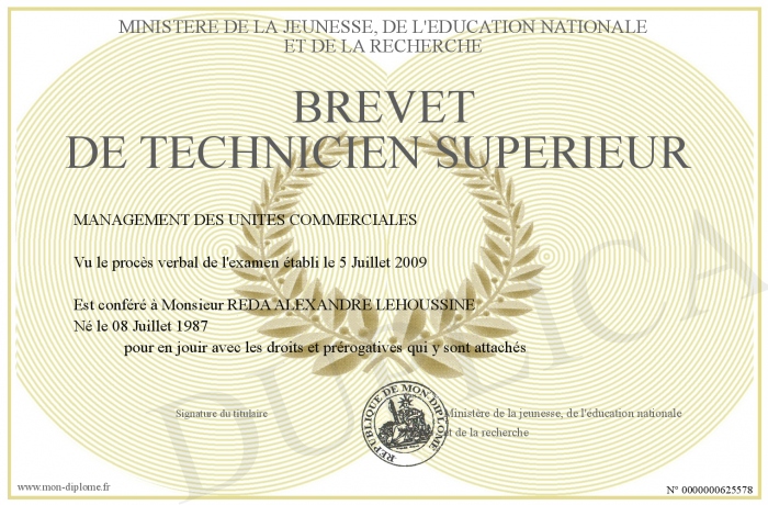 Envoyez par email votre Brevet de Technicien Supérieur personalisé
