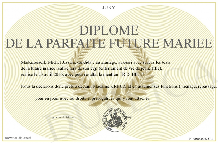 Envoyez par email votre Diplôme de la parfaite future mariée personalisé