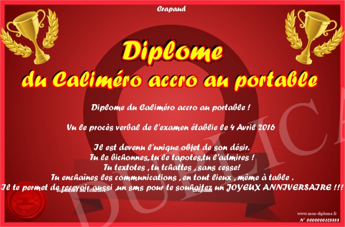 Envoyez par email votre Diplôme du Caliméro accro au portable personalisé