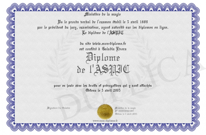 Envoyez par email votre Diplôme de l'ASPIC personalisé
