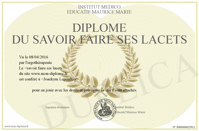 Envoyez par email votre Diplôme du Savoir faire ses lacets personalisé