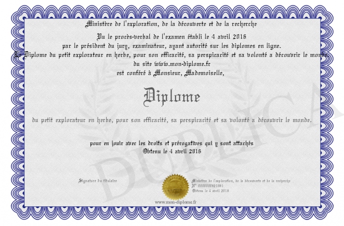 Envoyez par email votre Diplôme du petit explorateur en herbe, pour son efficacité, sa perspicacité et sa volonté a découvrir le monde. personalisé