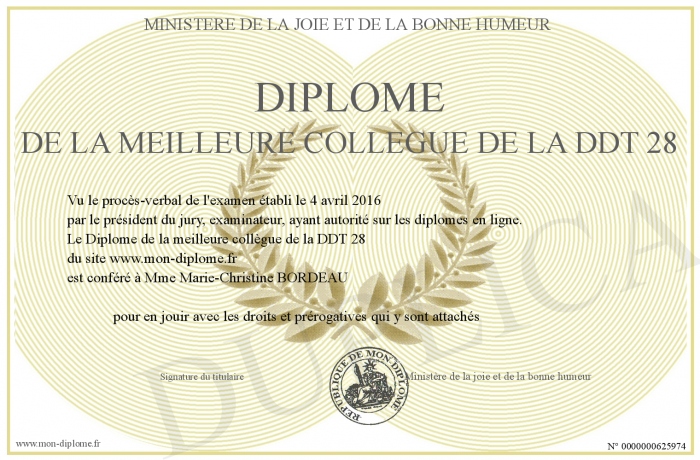 Envoyez par email votre Diplome de la meilleure collègue de la DDT 28 personalisé