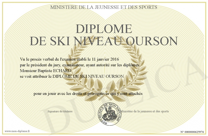 Envoyez par email votre Diplôme de ski niveau ourson personalisé