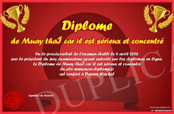 Envoyez par email votre Diplôme de Muay thaÏ car il est sérieux et concentré personalisé