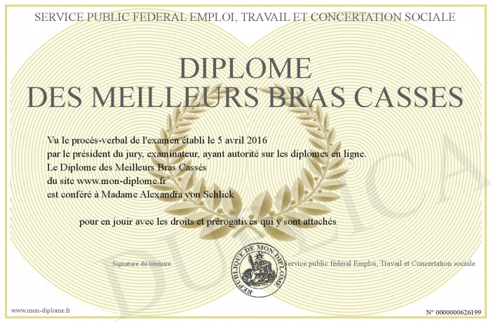 Envoyez par email votre Diplôme des Meilleurs Bras Cassés personalisé