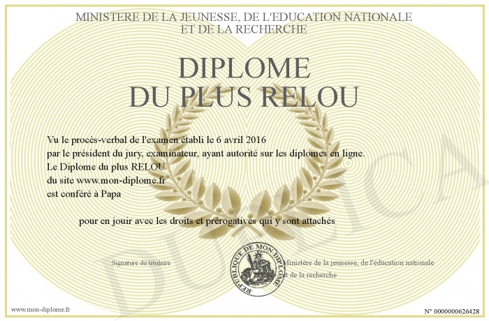 Envoyez par email votre Diplôme du plus RELOU personalisé