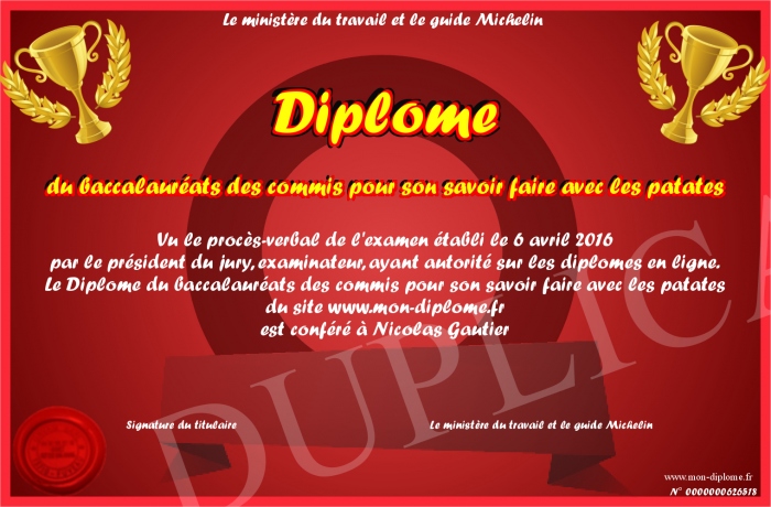 Envoyez par email votre Diplôme du baccalauréats des commis pour son savoir faire avec les patates personalisé
