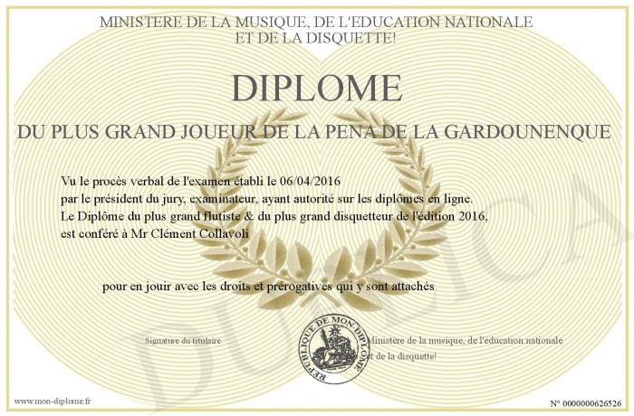 Envoyez par email votre Diplôme du plus grand joueur de la Pena de la Gardounenque personalisé