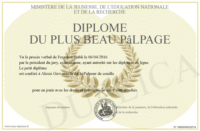 Envoyez par email votre Diplôme du plus beau pâlpage personalisé