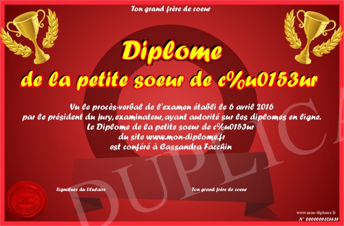 Envoyez par email votre Diplôme de la petite soeur de coeur personalisé