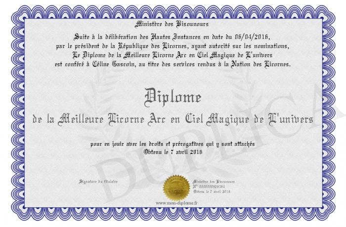 Envoyez par email votre Diplôme de la Meilleure Licorne Arc en Ciel Magique de L'univers personalisé
