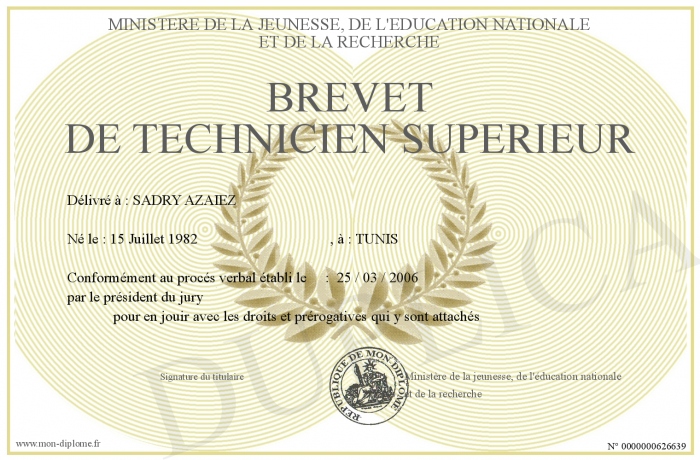 Envoyez par email votre Brevet de Technicien Supérieur personalisé