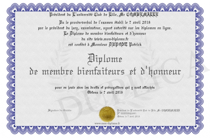 Envoyez par email votre Diplome de membre bienfaiteurs et d'honneur personalisé
