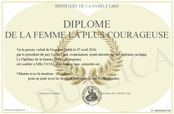 Envoyez par email votre Diplôme de la femme la plus courageuse personalisé