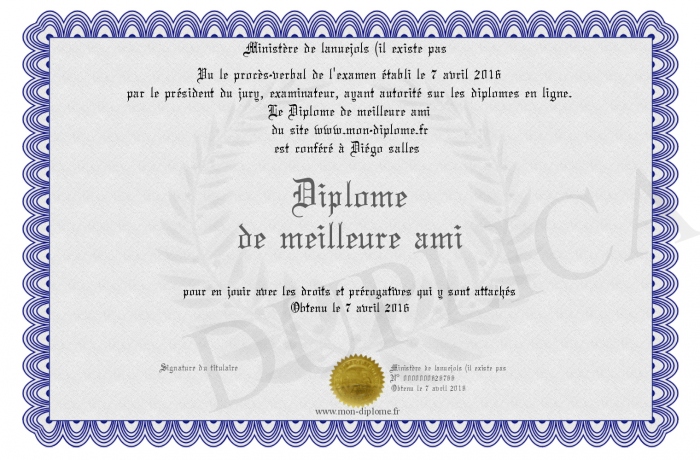 Envoyez par email votre Diplôme de meilleure ami personalisé