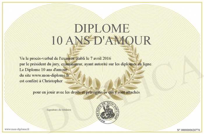 Envoyez par email votre Diplôme 10 ans d'amour personalisé