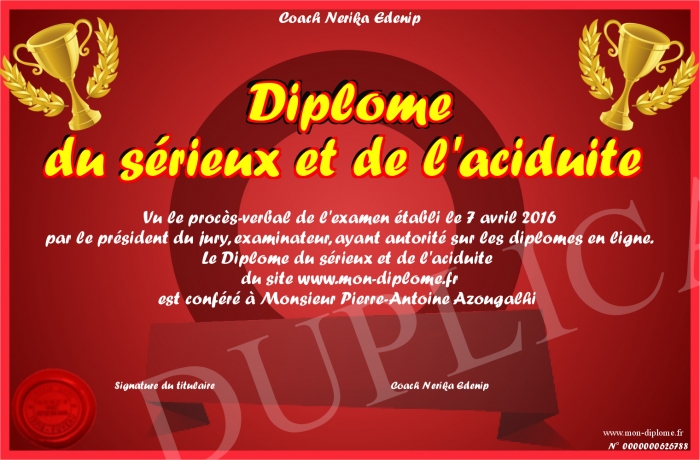 Envoyez par email votre Diplôme du sérieux et de l'aciduite personalisé