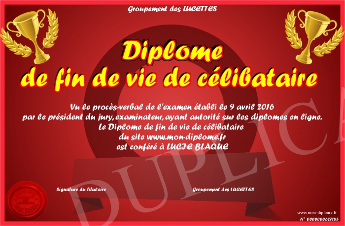 Envoyez par email votre Diplôme de fin de vie de célibataire personalisé