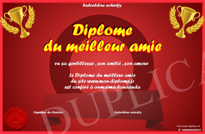 Envoyez par email votre Diplôme du meilleur amie personalisé