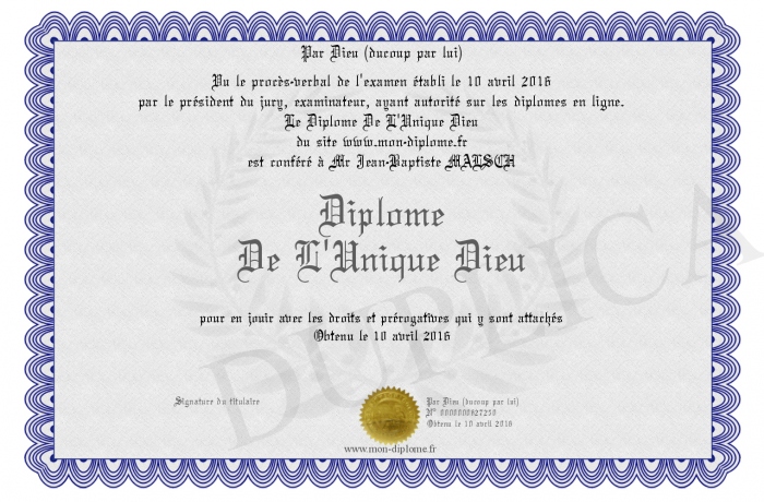 Envoyez par email votre Diplôme De L'Unique Dieu personalisé