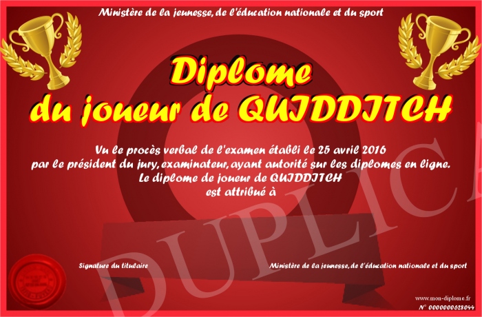 Envoyez par email votre Diplôme du joueur de QUIDDITCH personalisé