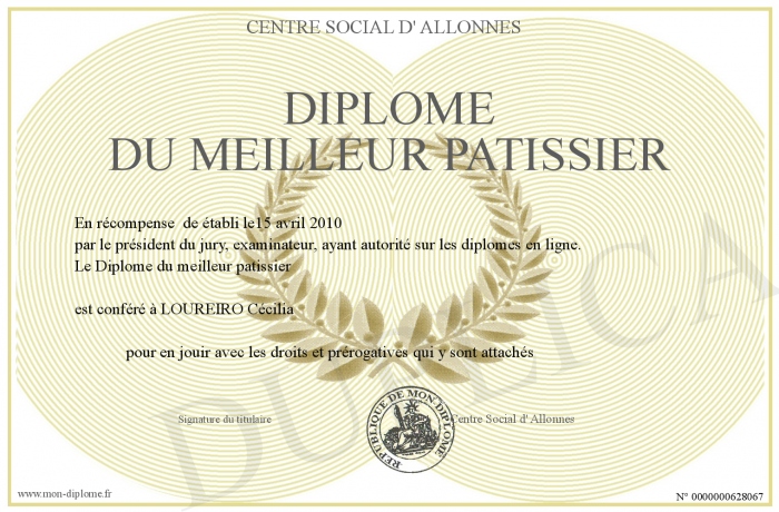 Envoyez par email votre Diplôme du meilleur patissier personalisé