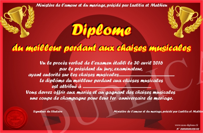 Envoyez par email votre Diplôme du meilleur perdant aux chaises musicales personalisé