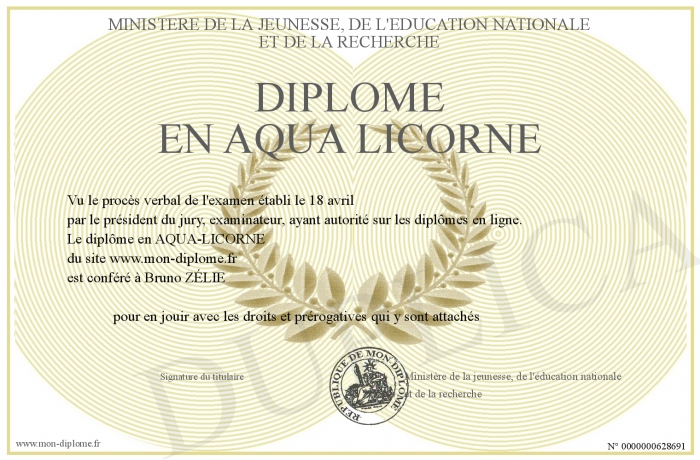 Envoyez par email votre Diplôme en AQUA LICORNE personalisé