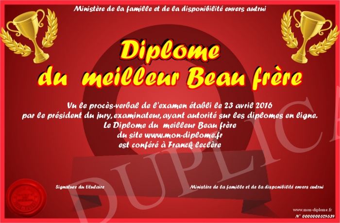 Envoyez par email votre Diplôme du meilleur Beau frère personalisé