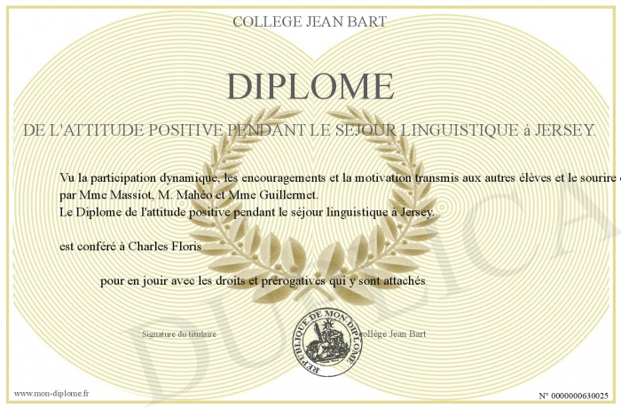 Envoyez par email votre Diplôme de l'attitude positive pendant le séjour linguistique à Jersey. personalisé