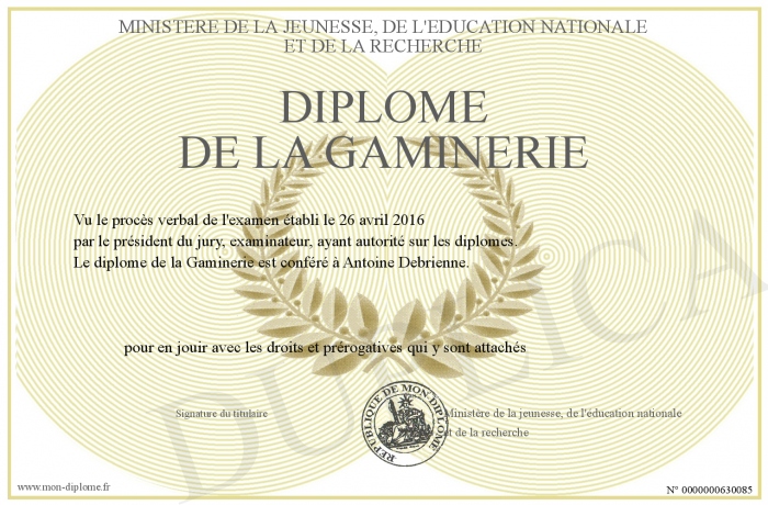 Envoyez par email votre Diplôme de la Gaminerie personalisé