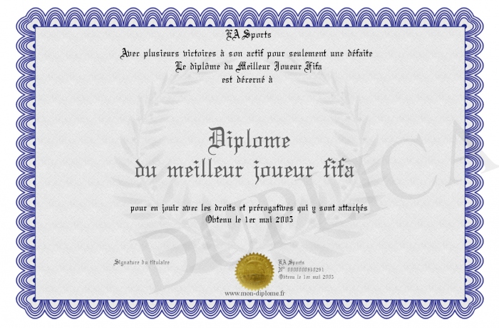 Envoyez par email votre Diplôme du meilleur joueur fifa personalisé
