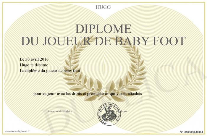 Envoyez par email votre Diplôme du joueur de baby foot personalisé