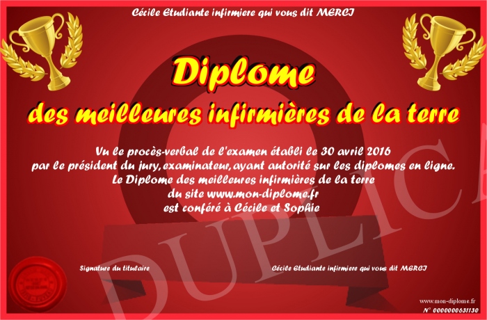 Envoyez par email votre Diplôme des meilleures infirmières de la terre personalisé
