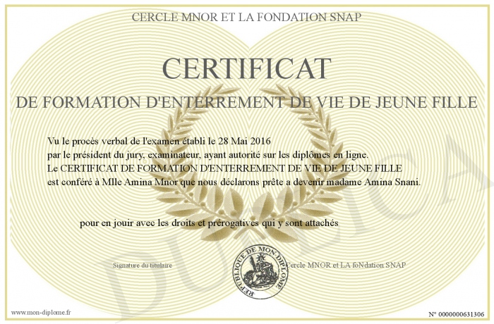 Envoyez par email votre CERTIFICAT DE FORMATION D'ENTERREMENT DE VIE DE JEUNE FILLE personalisé