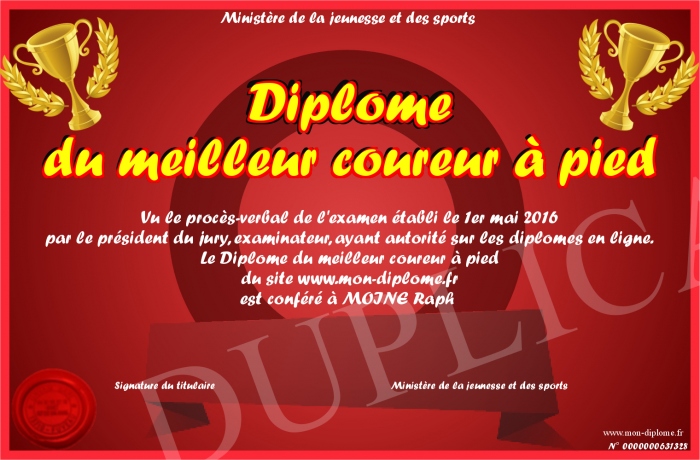 Envoyez par email votre Diplome du meilleur coureur à pied personalisé